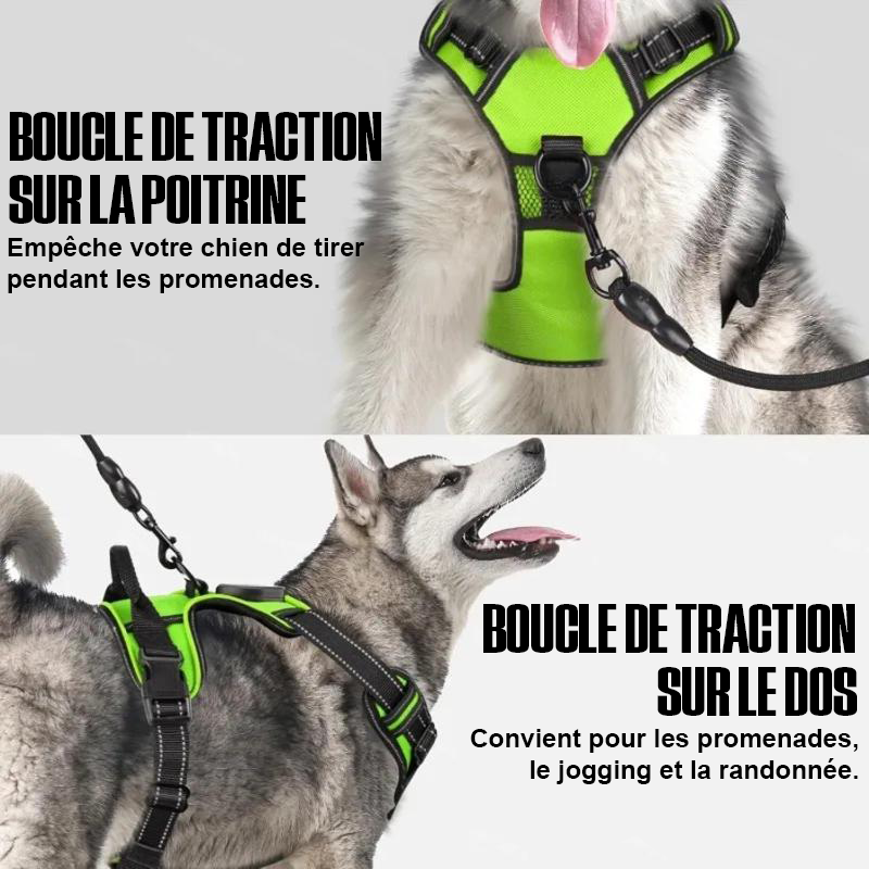 Grâce à ses deux points d’attache, ce harnais vous offre une flexibilité totale : la boucle située à l’avant, sur la poitrine, est parfaite pour décourager les chiens qui tirent et rendre les promenades plus agréables. Elle vous aide à garder le contrôle tout en guidant votre compagnon en douceur. La boucle à l’arrière, sur le dos, est quant à elle idéale pour les promenades tranquilles, le jogging ou encore les randonnées, offrant à votre chien davantage de liberté de mouvement tout en restant parfaitement sécurisé.