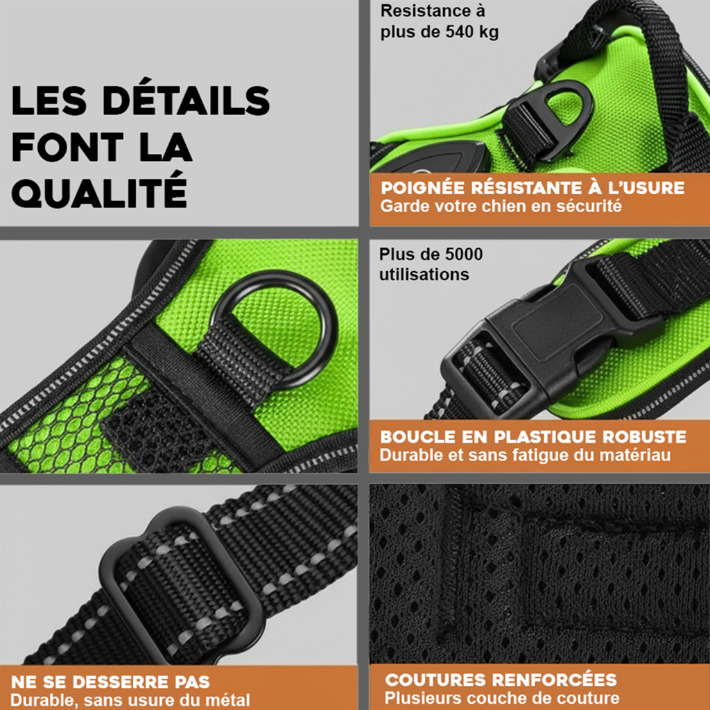 Le harnais est conçu pour résister aux éclaboussures, idéal pour les promenades par temps humide.